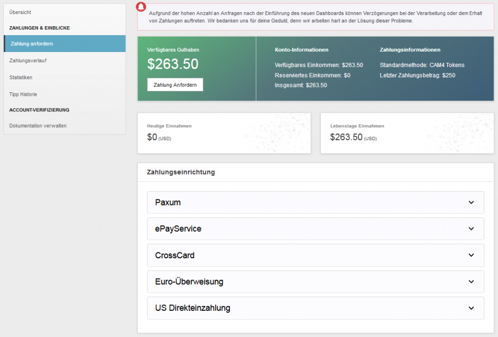 Bitte kontaktieren Sie unser Zahlungsteam unter payments@cam4.com.