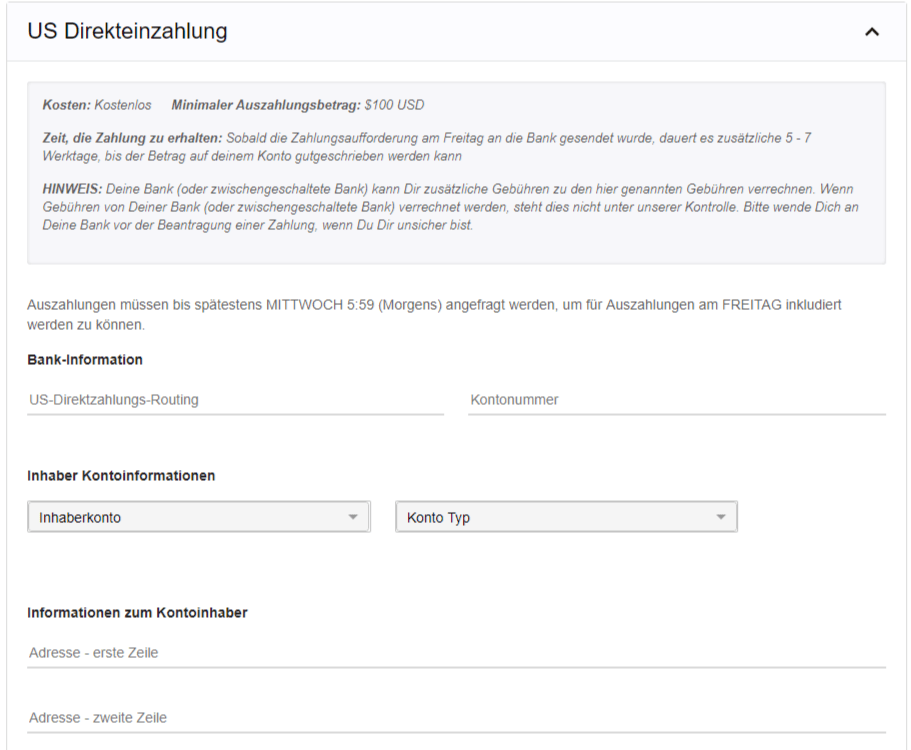 Ab Januar 2025 können unabhängige Performer oder Studios, die die erforderlichen Informationen nicht bereitstellen, keine Zahlungen erhalten. Bitte beachten Sie: Dies gilt auch für Trinkgelder in Form von Tokens. Obwohl Trinkgelder in Form von Tokens nicht in die von uns einzureichenden Informationen einbezogen sind, können sie dennoch nicht verwendet werden, bis wir Ihre korrekten Informationen vorliegen haben.