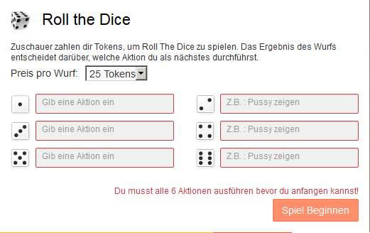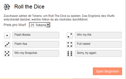 Roll The Dice ist ein Trinkgeldspiel, das du während Übertragungen aktiviert kannst. Die Darsteller versehen die 6 Würfelseiten jeweils mit einem Preis und die Zuschauer zahlen, um zu spielen!