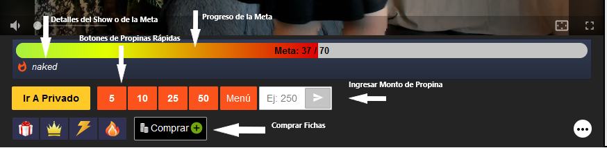 Para enviar una cantidad de propina diferente a la que se ofrece a través de los Botones de propinas rápidas, aquí puede ingresar la cantidad de fichas que le gustaría enviar al modelo. Envíe una propina generosa para mostrar cuánto disfruta el espectáculo. Una propina baja puede malinterpretarse como un insulto, así que de sus propinas sabiamente.
