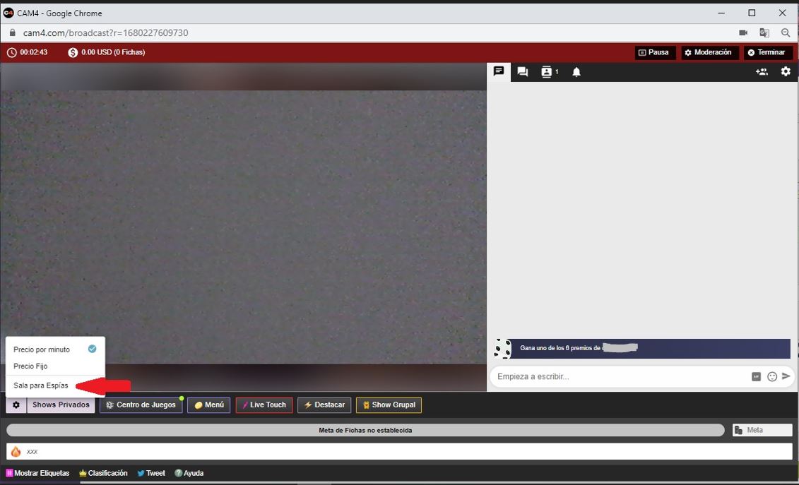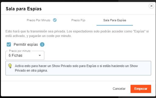 - Precio en fichas por minuto para espectador