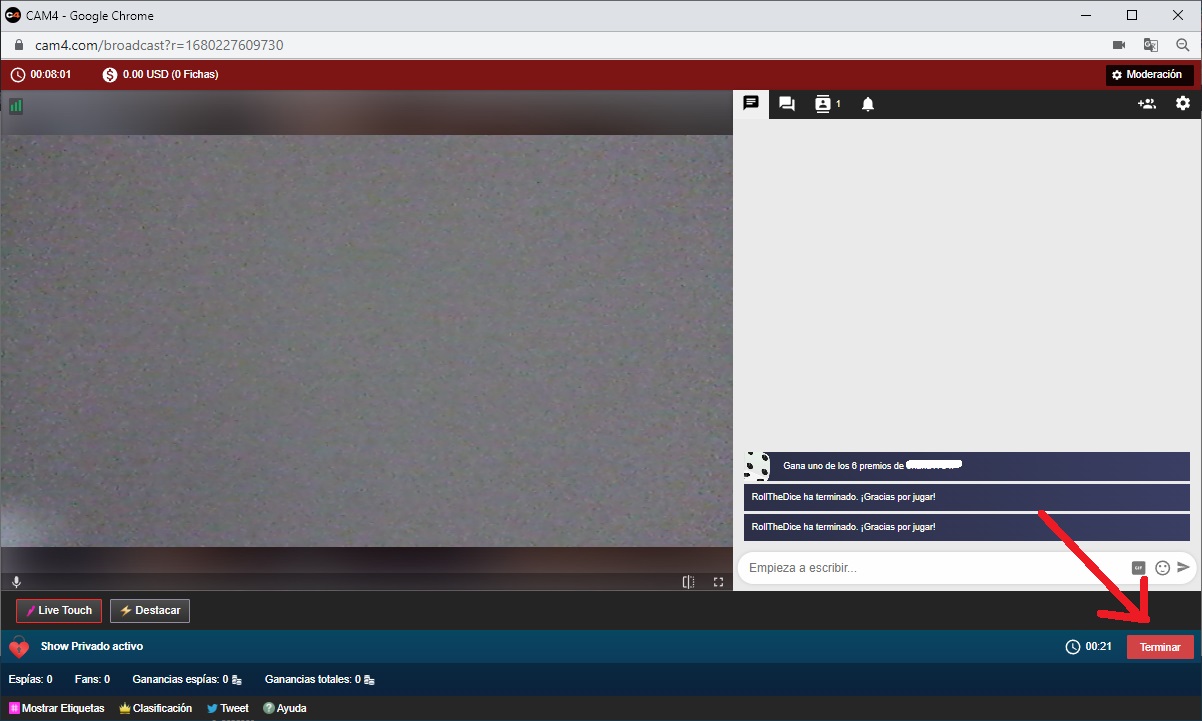 Una vez el show haya terminado verás un resumen en el que podrás ver el total de fichas que has ganado por ese show privado.