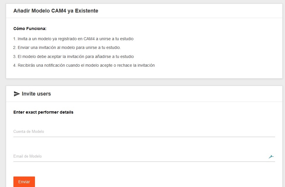 Si tienes un/una modelo que ya está registrado/a en CAM4 pero no es parte de tu estudio, puedes enviar una invitación para que se añada a tu estudio!