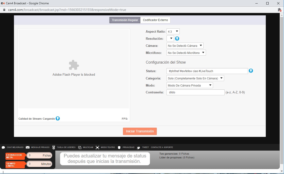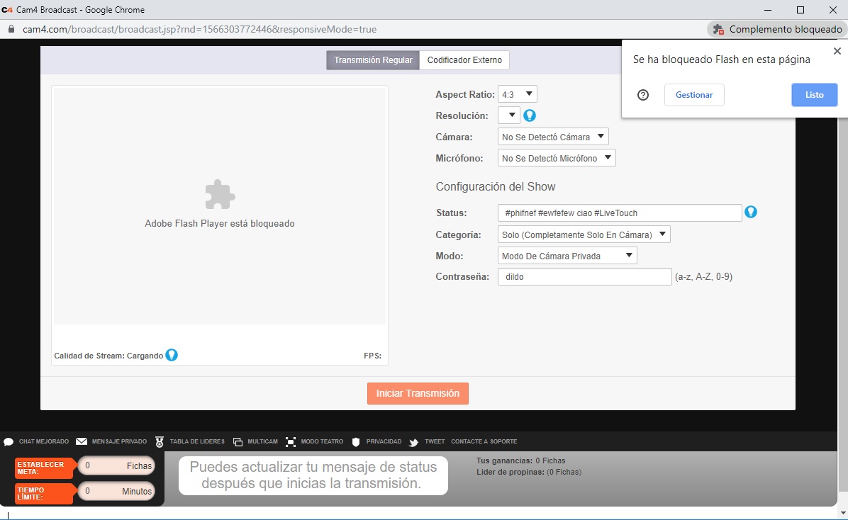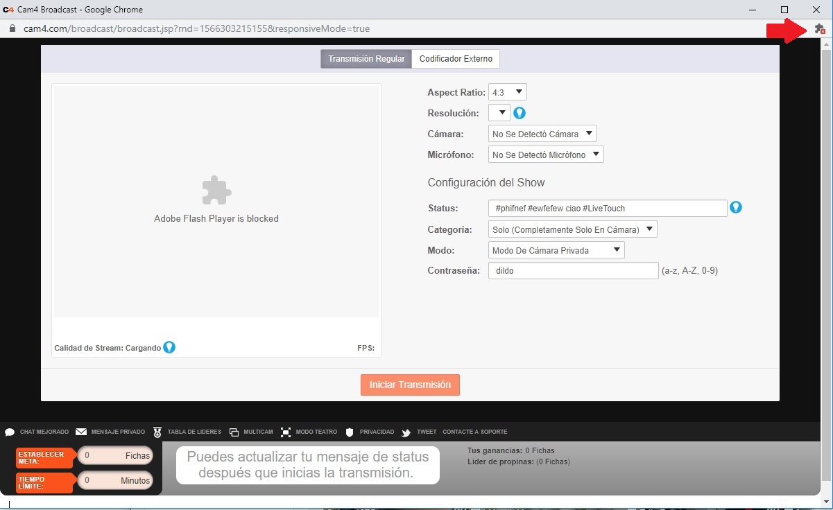 Debido a cambios recientes, puedes encontrarte con que tu navegador bloquea Flash cuando intentas transmitir. Verás la siguiente ventana al usar Google Chrome