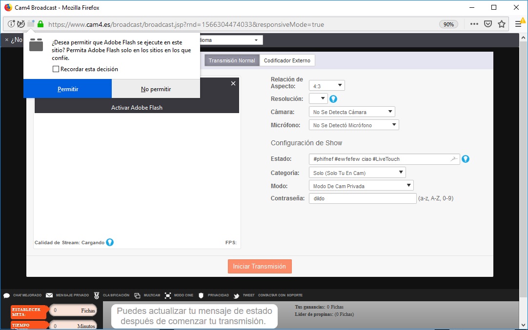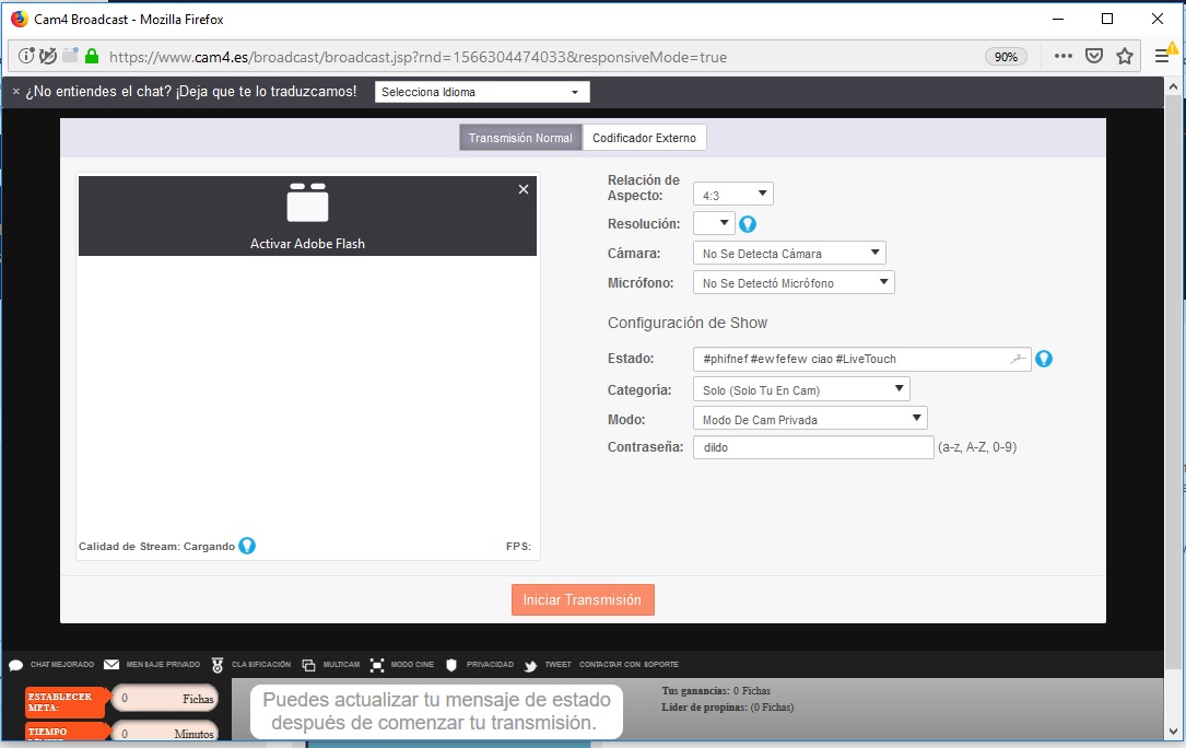 9. ¿Has probado a transmitir con un codificador externo? OBS es un codificador externo excelente que ofrece un funcionamiento mejor que el codificador Flash. Prueba a transmitir usando OBS – verás la diferencia en la calidad de tu video. Para más info mira https://www.cam4.com/faq/open-broadcaster-software-obs. Si necesitas ayuda con la configuración o para transmitir con OBS por favor contacta con el soporte de CAM4.
