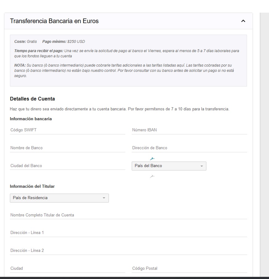 • Información requerida: Código SWIFT, IBAN, Nombre y dirección del titular de la cuenta, Nombre y dirección del banco