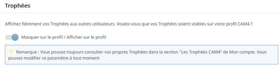 Oui! Les Trophées débloqués apparaissent sur votre page de profil CAM4. Vous pouvez également voir ce que vos amis et les autres membres de CAM4 ont débloqué sur leurs pages de profil.