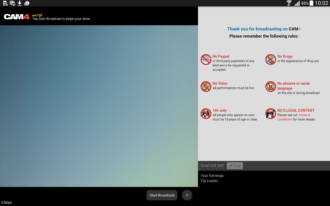 Cam4 Broadcaster est une application mobile que vous pouvez utiliser sur Cam4 pour diffuser depuis tout appareil Android. Veuillez noter que cette application est en phase finale beta.