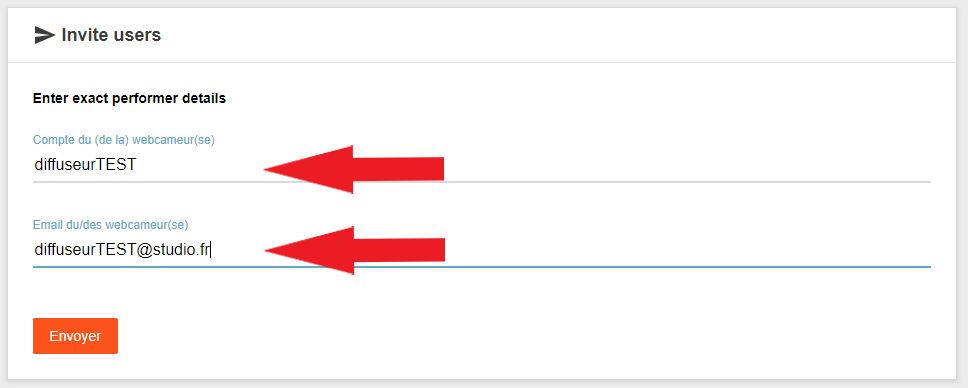 Sur la page suivante, entrez son “Nom d’utilisateur” du diffuseur que vous invitez, ainsi que l’adresse mail associée à son compte CAM4. Une fois entrés, cliquez sur le bouton Envoyer.