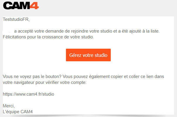 Une fois acceptée, ils auront une confirmation qu’ils font maintenant partie de votre studio.