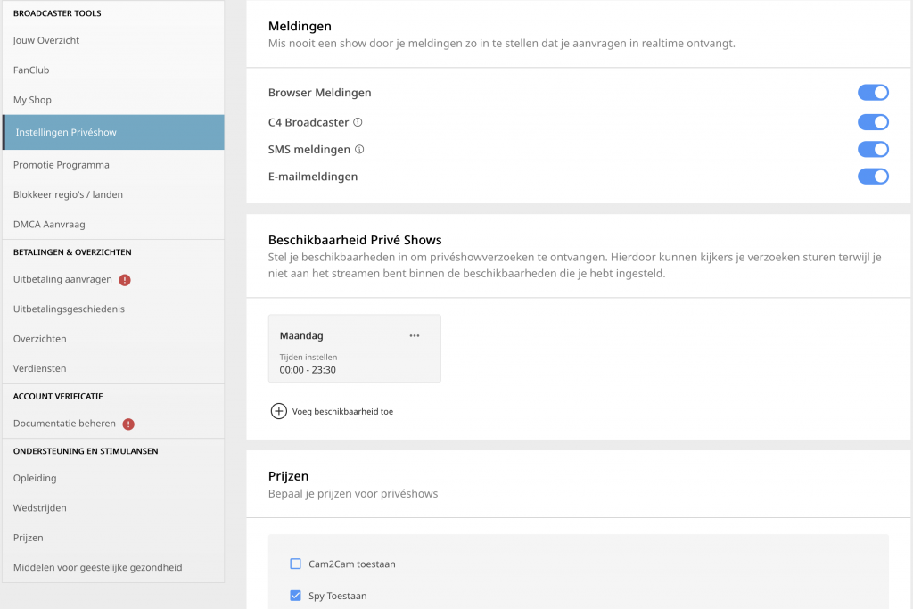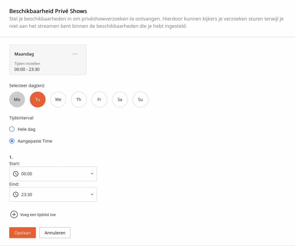 - Beschikbaarheid voor Privateshows: Definieer de dagen en tijden waarop je beschikbaar bent voor OPS-aanvragen.