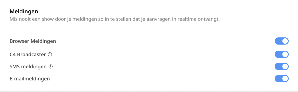 Meldingen: Door meerdere meldingskanalen in te stellen, mis je nooit een kans om in contact te komen met je publiek. Of je nu meldingen ontvangt via de browser, e-mail, SMS of de C4 Broadcaster-app, deze kanalen houden je verbonden, zelfs offline. Dit zorgt ervoor dat je fans je op het juiste moment kunnen bereiken, wat hun ervaring verbetert en je potentiële inkomsten verhoogt.