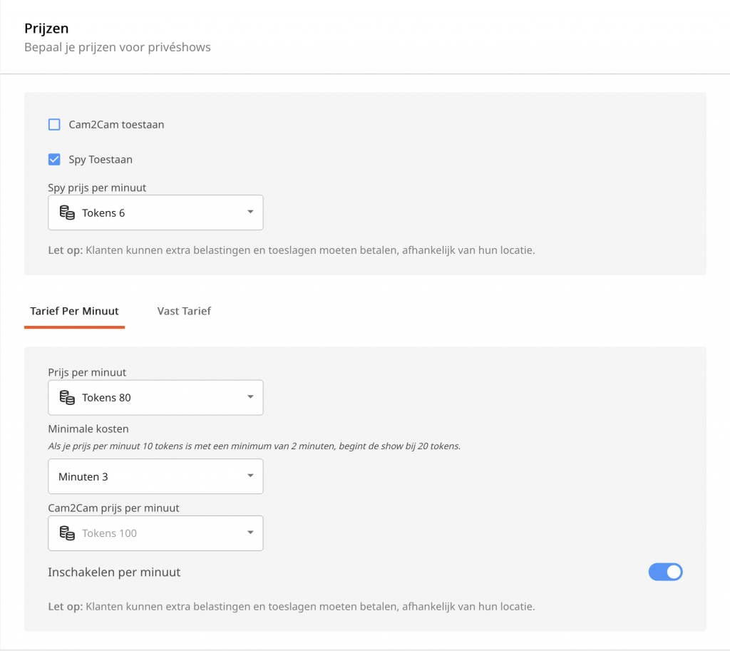De sectie “Prijzen” stelt je in staat om verschillende prijsniveaus te definiëren op basis van de duur van de privateshows die je aanbiedt. Deze flexibiliteit stelt je in staat om zowel korte interacties als langere, meer gepersonaliseerde sessies te accommoderen.