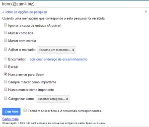 - Assegure se que a opção “Nunca enviar para Spam” esteja marcada.