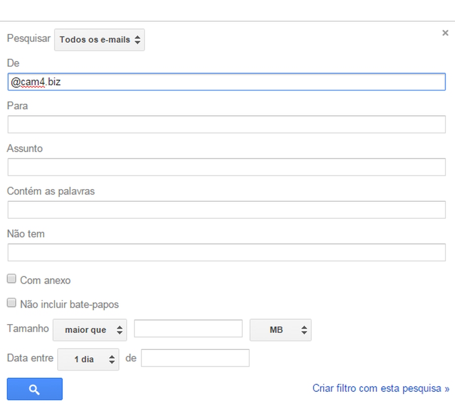 - Clique no triângulo virado para baixo, ao lado da lupa, para abrir as opções de pesquisa do Gmail.