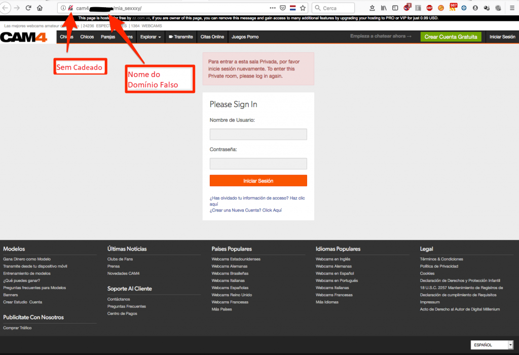 A presença do cadeado à esquerda da URL mostra que temos o certificado de segurança para o domínio e o link é válido. Uma página falsificada não terá isso. Veja o exemplo abaixo
