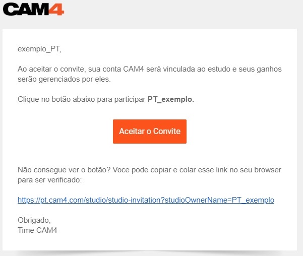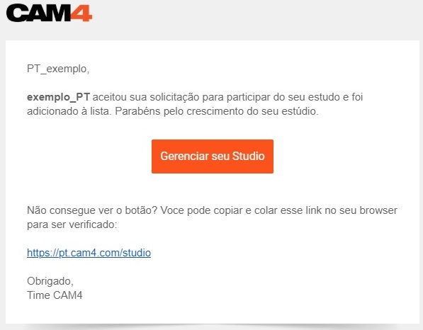 Seu modelo receberá um convite por e-mail, bem como uma nota do convite em sua caixa de entrada do CAM4.