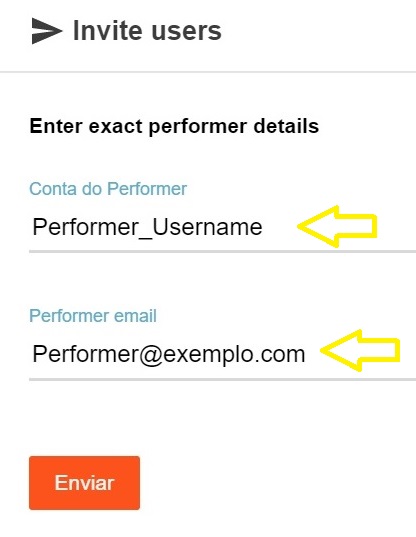 Na próxima página, insira o “Nome de usuário (username)” do Performe que você está convidando, juntamente com o e-mail associado à conta CAM4 do Performer. Uma vez inserido, clique no botão Enviar.