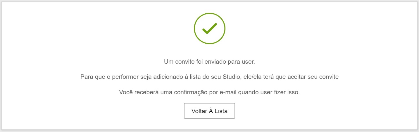 Assim que o Performer aceitar, ela verá a confirmarção que agora faz parte do seu Estúdio.