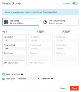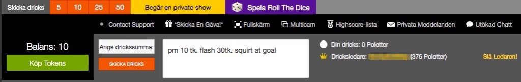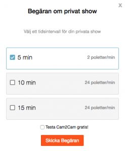 Genom att klicka på knappen kan användare delta i en privat Cam2Cam-föreställning mot token. Detta ger en mer intim plats för användare utan möjligheten för andra att tjuvkika på föreställningen.