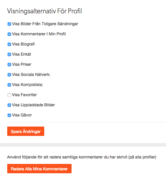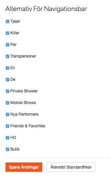 Här kan du välja vilka flikar som ska visas på Cam4’s hemsida. Som standard är alla flikar synliga.