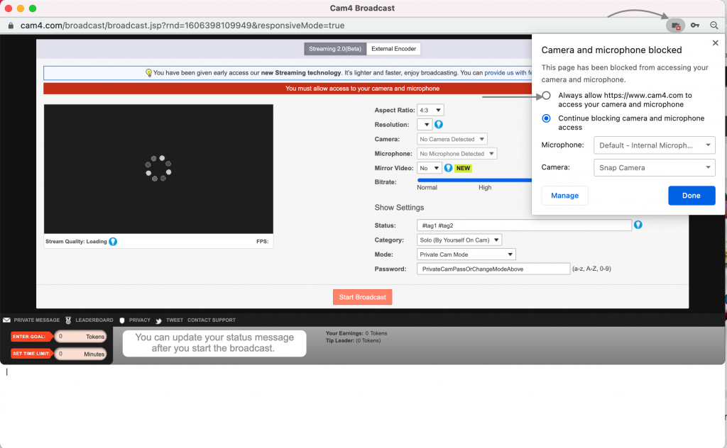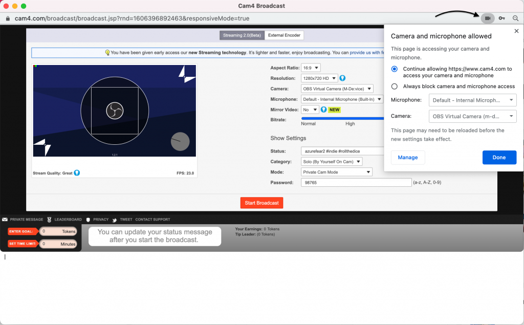 - Börja strömma på CAM4 med fliken Streaming 2.0 eller Extern kodare.